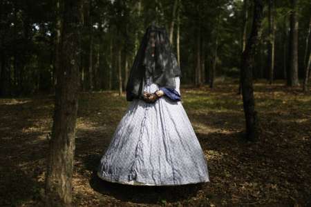 FILE – Reenactor Allie Chastka poses for a portrait covering her face with a black veil after the unveiling coeremony for a Confederate monument called “Unknown Alabama Confederate Soldiers” in the Confederate Veterans Memorial Park in Brantley, Ala., on Sunday, Aug. 27, 2017. The NAACP spoke out against the project, calling it a step backward. (AP Photo/Brynn Anderson)