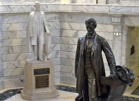 In this Wednesday, Aug. 5, 2015 file photo, a statue of Jefferson Davis, left, looks towards a statue of Abraham Lincoln in the Rotunda of the Kentucky State Capitol in Frankfort, Ky. Did 620,000 die, as Northerners would have it, in a noble quest to save the union and end slavery _ the nation’s horrific original sin? Or was the “War Between the States” a gallant crusade to limit federal power, with slavery playing a lesser part, as Southerners insisted? (AP Photo/Timothy D. Easley)