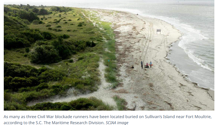 “Historical records indicate that several American Civil War blockade runners wrecked in the shallow waters around the fort, but their exact locations were forgotten,” the division reported in a social media post. “Because Sullivan’s Island has been marching steadily southward … since the construction of the Charleston Harbor jetties, what once was water for ships to wreck in is now dry land. The remains of these vessels are now buried deep below the beach and adjacent woodlot.”