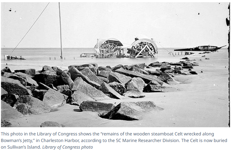 The Celt was a sidewheel paddle steamer that ran ashore while trying to leave the harbor, historians say. Union troops boarded the vessel and “found the back or keel of the hull broken and full of water, decks ripped apart, and the boilers below water along with the machinery, and deemed it worthless to recover,” Civil War Traveler reports. A cargo of cotton was also found and salvaged to be taken North, the site says.