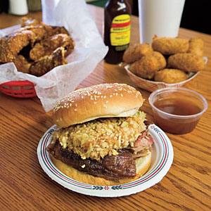 The manager, Nathan Monk, grandson of original owner Wayne Monk, takes me to the kitchen to see how they cook pork shoulders, which is what they’re known for out here. In the kitchen, the pitman is chopping up shoulders, the exteriors crusty and copper-colored, the interiors spilling rivulets of juice. Monk describes the labor-intensive cooking process, from the pitman carefully tending the fire to chopping to a texture that’s just right. The dining room is always full, and family members such as Monk are prepared to take the reins. “We haven’t changed anything, and unless the health department makes us, we never will,” he says.