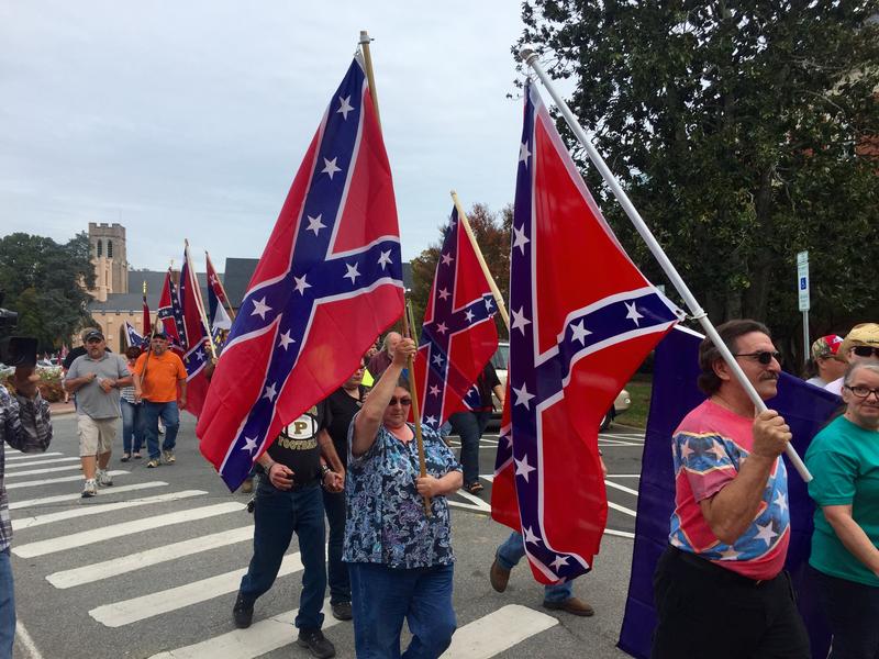 The pick-up trucks and cars adorned with Confederate and American flags flapping in the air were hard to miss as they rolled down Franklin Street.