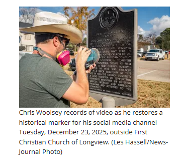 What started as childhood resentment for his dad’s mandatory roadside history stops on family vacations has evolved into a full-blown passion for Chris Woolsey. Woolsey is now on a heartfelt mission to breathe new life into Texas’ fading historical markers. On a mild Tuesday afternoon just before Christmas, Woolsey set up his camera and tripod near a weather-worn historical marker outside First Christian Church in Longview. Sandpaper in hand, he began transforming the sun-faded marker back to its past glory.