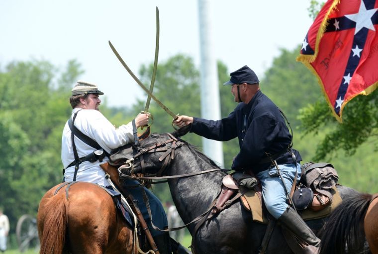 Actors performing as Confederate and Union soldiers sword fight during one of the demonstrations in Temple on Saturday.